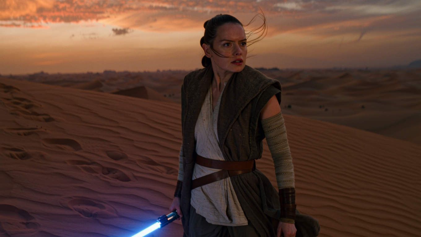 An intense cinematic close-up of Daisy Ridley as Rey from Star Wars, standing resolutely atop a windswept desert dune at sunset. Rey's iconic Jedi attire shows signs of struggle and adventure, her expression serious yet hopeful as she gazes thoughtfully towards distant horizons. Her hand grips tightly around a glowing, ignited blue lightsaber, its vibrant energy casting soft reflections against her face and clothing. Gentle gusts of wind lift strands of her hair, while the desert sky behind her blends warm oranges and purples, creating a dramatic, inspiring atmosphere of destiny and courage. in a photorealism, cinematic, mysterious style, viewed from a close-up shot, shot on panavision millennium dxl2 with panavision primo lenses, sunny lighting, at afternoon, with a cinematic, futuristic vibe, accented by warm glow, bright highlights, dramatic shadows, lens flare, featuring warm colors, limited palette, beige, brown, gold colors, with textured, reflective, luminescence effects --v 7 --ar 16:9 --c 50 --s 850 --oref https://dhzkdndgolte1.cloudfront.net/eyJidWNrZXQiOiJtcG0tcHJvZHVjdGlvbi0yMDI1Iiwia2V5IjoicHJvbXB0cy8ydHg3ejdpc2gxazl1azQvaW1hZ2VzLzE3NTI0NjExMTgwNjAtMy0xOS0yNS1yZXkucG5nIiwiZWRpdHMiOnsicmVzaXplIjp7IndpZHRoIjo0MDAsImhlaWdodCI6MzAwLCJmaXQiOiJpbnNpZGUifSwicXVhbGl0eSI6ODV9fQ== --w 0