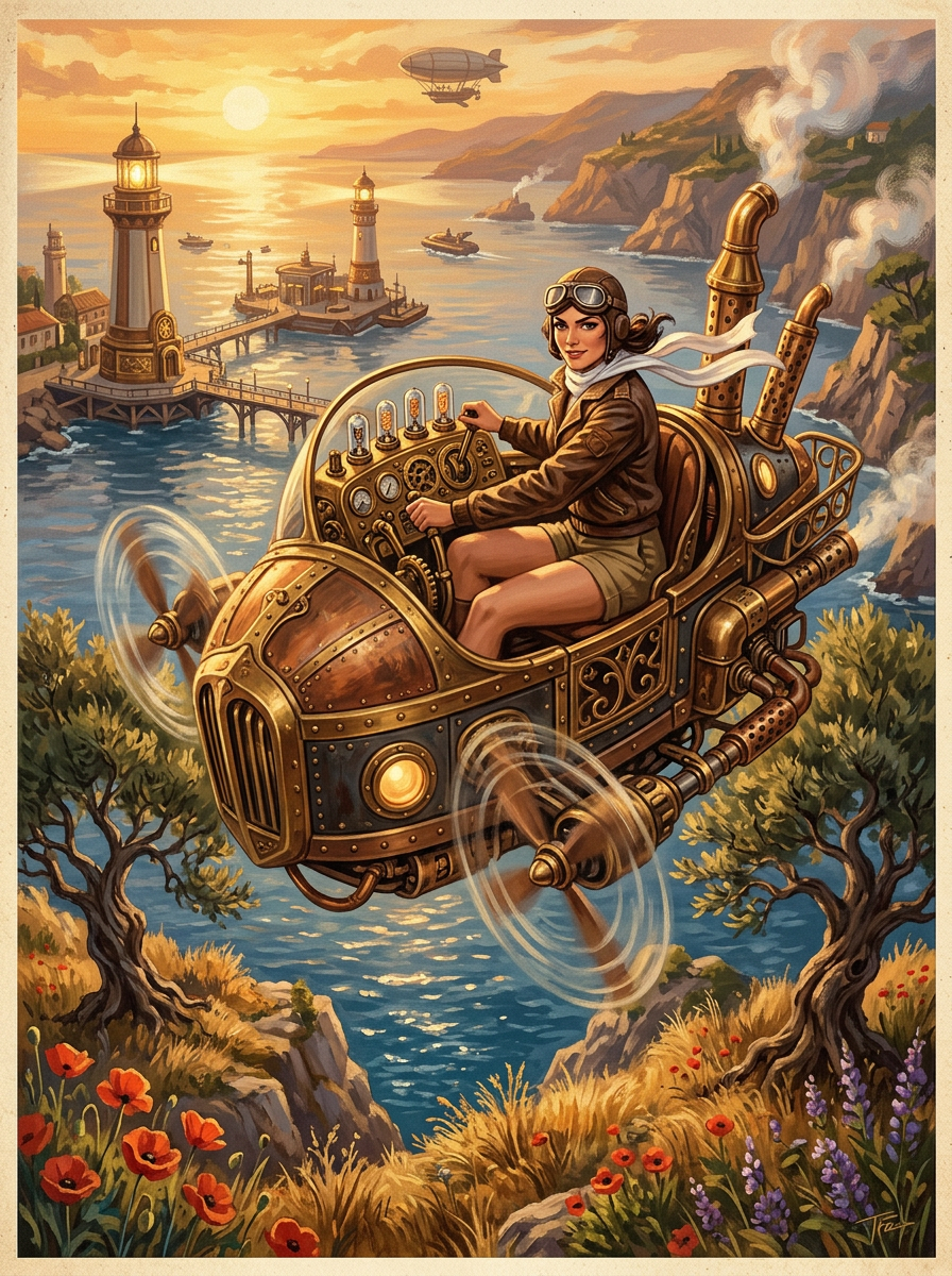 https://dhzkdndgolte1.cloudfront.net/eyJidWNrZXQiOiJtcG0tcHJvZHVjdGlvbi0yMDI1Iiwia2V5IjoicHJvbXB0cy9kaG5wN3ZqbGY4djVxanEvaW1wb3J0cy8xNzcwMTY3Njk1NDI3LWNkeHVyNy5wbmciLCJlZGl0cyI6eyJxdWFsaXR5Ijo5NX19 https://dhzkdndgolte1.cloudfront.net/eyJidWNrZXQiOiJtcG0tcHJvZHVjdGlvbi0yMDI1Iiwia2V5IjoicHJvbXB0cy9kaG5wN3ZqbGY4djVxanEvaW1wb3J0cy8xNzcwMTY4NDk4NjQxLXM3cHJxNS5wbmciLCJlZGl0cyI6eyJxdWFsaXR5Ijo5NX19 https://dhzkdndgolte1.cloudfront.net/eyJidWNrZXQiOiJtcG0tcHJvZHVjdGlvbi0yMDI1Iiwia2V5IjoicHJvbXB0cy9kaG5wN3ZqbGY4djVxanEvaW1wb3J0cy8xNzcwMTY4NTMyODYyLTNidmppNi5wbmciLCJlZGl0cyI6eyJxdWFsaXR5Ijo5NX19 A confident female aviator in vintage brown leather flight jacket, aviator goggles, and khaki shorts with bare legs, piloting an intricate brass and copper steampunk hovercraft with exposed gears, spinning propellers, and ornate Victorian pipes releasing gentle steam wisps, hovering above Mediterranean coastal cliffs dotted with wild poppies and ancient olive trees, retro-futuristic elements like floating platforms and Art Deco lighthouses in distance, warm sunset amber and brass gold tones, painterly impressionistic style blending vintage travel poster art with dieselpunk aesthetics in a steampunk, confident, adventurous, nostalgic style, viewed from a medium-shot, low-angle-shot, shot on vintage-lens, golden-hour lighting, at sunset, with a vintage, futuristic vibe, accented by warm-ambient, sunset-glow, soft-shadows, glowing-highlights, featuring warm-tones, vintage-film, tetrachromatic, amber, brass, copper, cream, warm, vintage, with leather, brass, copper, polished, none --v 7 --ar 3:4 --c 15 --w 0 --q 1 --s 400 keypromptninja