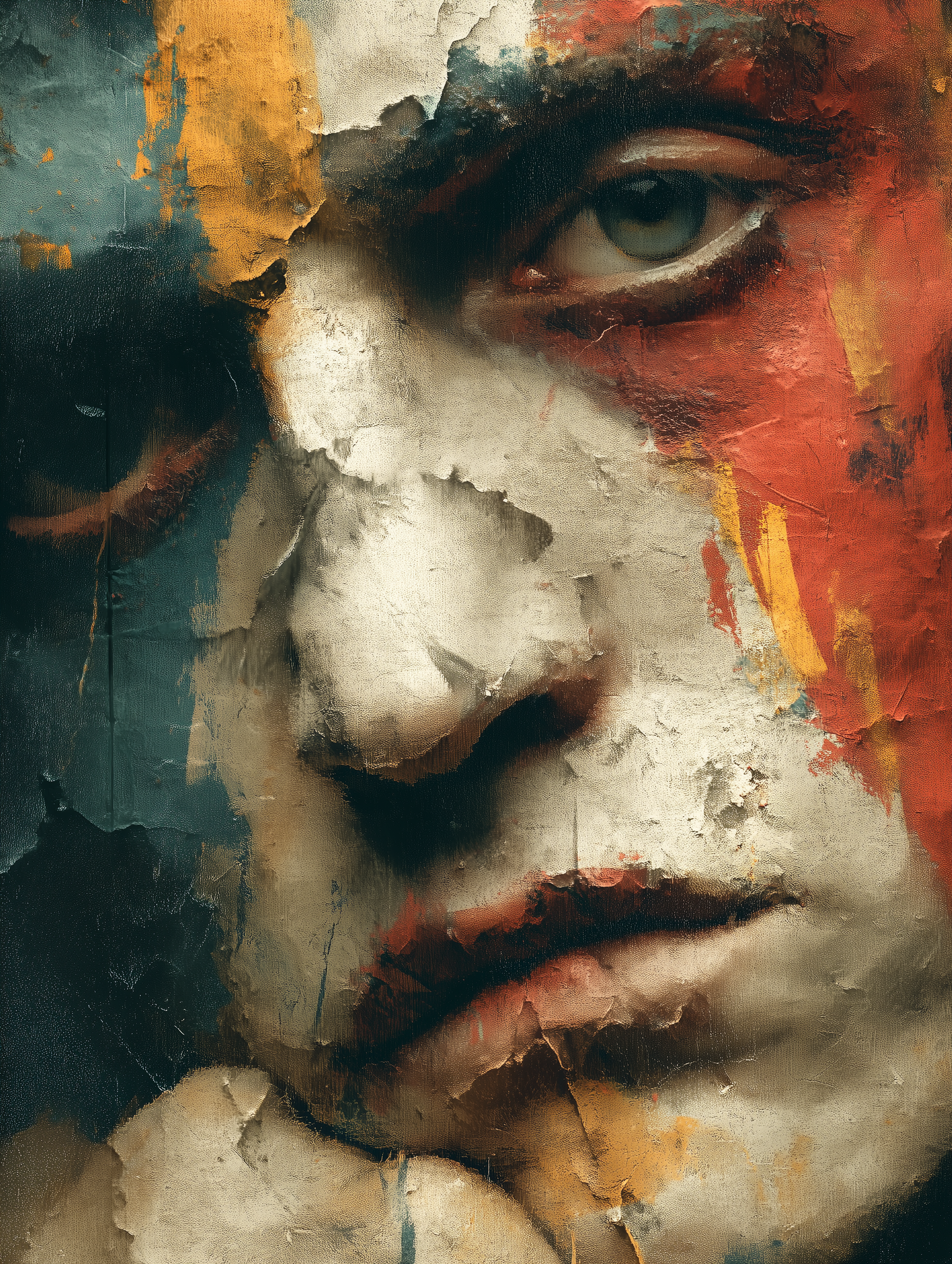 Extreme close-up portrait of a middle-aged man, face etched with deep concern and psychological tension, features slightly distorted and fragmented as if cracking apart under emotional weight, bold visible brushstrokes smearing across skin, jawline and brow, paint bleeding and dripping at edges, haunted searching eyes with raw intensity, one eye slightly larger creating asymmetry, background bleeding into figure with wild gestural marks in a neo-expressionism, anxious, intense, fragmented, psychological style, viewed from a extreme-close-up-shot, at none, with a dark-and-moody, chaotic vibe, accented by chiaroscuro, dramatic-shadows, high-contrast, featuring desaturated, muted-colors, tetrachromatic, umber, sienna, crimson, muted, with cracked, dripping, matte --v 7 --ar 3:4 --c 20 --w 0 --q 1 --s 500