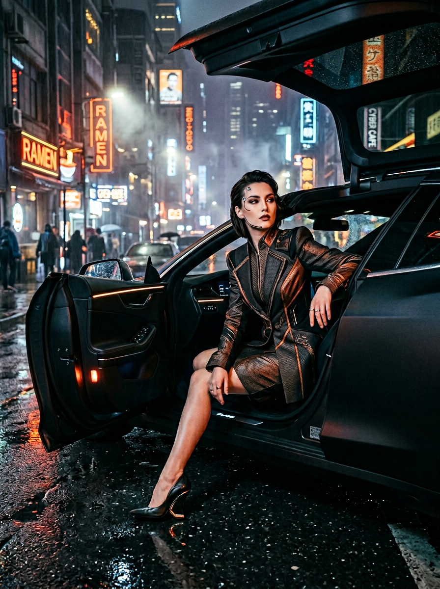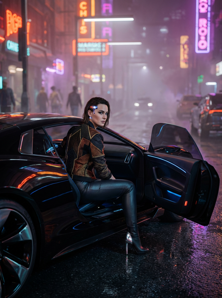 https://dhzkdndgolte1.cloudfront.net/eyJidWNrZXQiOiJtcG0tcHJvZHVjdGlvbi0yMDI1Iiwia2V5IjoicHJvbXB0cy96dXhoMGhoc3UxMGdvYTUvaW1wb3J0cy8xNzcyODEwNTE5MjAyLWh4Z3h2Ni5wbmciLCJlZGl0cyI6eyJxdWFsaXR5Ijo5NX19 A striking woman in haute couture cyberpunk fashion sits elegantly in the driver's seat of a sleek vehicle, door open, one designer heel touching rain-slicked asphalt. She wears an impeccably tailored high-fashion ensemble—structured jacket with sharp lines, luxurious fabrics catching warm neon reflections of burnt orange, deep red, and molten gold bleeding through atmospheric smog. Minimal cybernetic enhancements: a subtle neural interface at her temple, barely-visible carbon fiber accents along her jawline. She glances back over her shoulder down the neon-lit street with poised confidence and calculated awareness. Volumetric fog rolls through the cyber night cityscape, diffusing streetlights into halos of amber and crimson. Ultra-detailed textures: fine fabric weave, polished leather, delicate tech integration, subtle metallic threading in her couture. Cinematic depth of field keeps focus razor-sharp on her refined presence while the background city blurs into bokeh neon dreams in a cyberpunk, confident, elegant, atmospheric style, viewed from a medium-close-up-shot, high-angle-shot, shot on arri-alexa, foggy lighting, at night, with a cyberpunk, elegant, futuristic vibe, accented by neon-glow, city-lights, atmospheric-haze, volumetric-fog, god-rays, glowing-highlights, featuring cinematic-light, high-contrast-colors, tetrachromatic, orange, red, gold, charcoal, warm, with fabric, leather, polished, wet, glossy-reflection, wet-surface, subtle-glow --v 6.1 --ar 3:4 --c 15 --w 0 --q 1 --s 200 keypromptninja